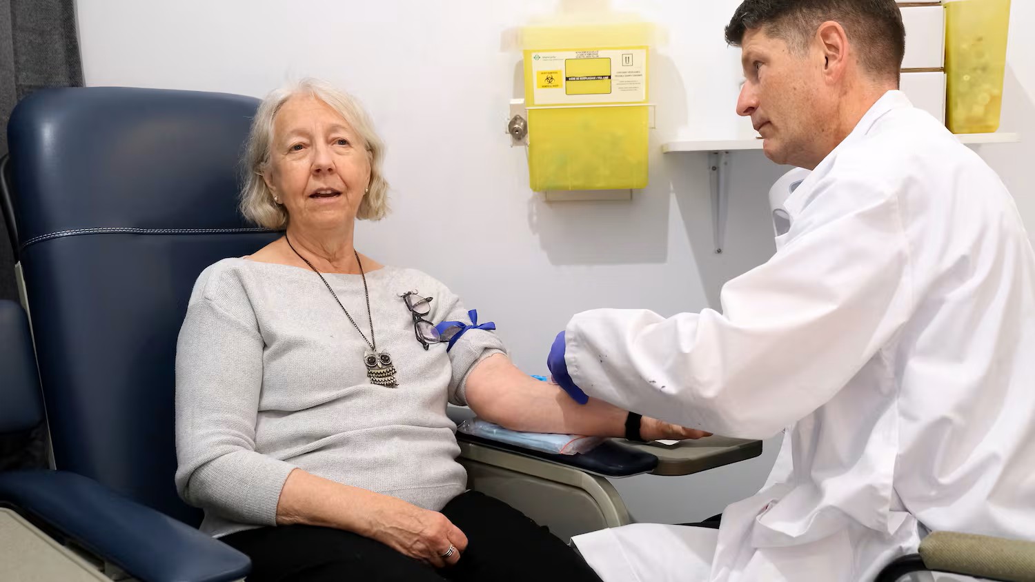 Au Centre StoP-Alzheimer de l’Institut universitaire en santé mentale Douglas, la participante Mireille Huneault reçoit une prise de sang de l’infirmier Réjean Savard dans le cadre d’un essai clinique pour tester si une nouvelle catégorie de médicaments contre l’insomnie peut prévenir l’apparition des symptômes de la maladie d’Alzheimer. Ils lancent un essai clinique à l’Institut Douglas de Montréal avec un médicament contre l’insomnie qui pourrait freiner le déclin cognitif
